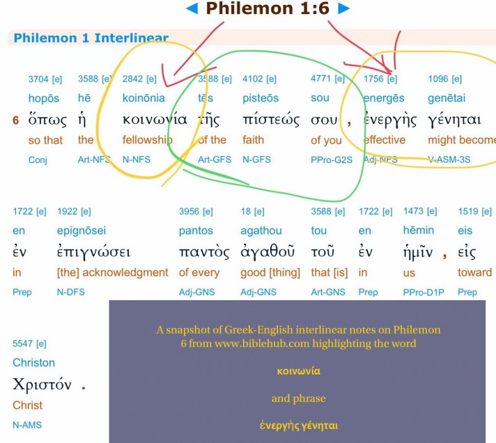 Below, an online interlinear Bible shows the Greek of Philemon 6 and in English relates literally, woodenly “the fellowship of the faith…” and “effective might become…”