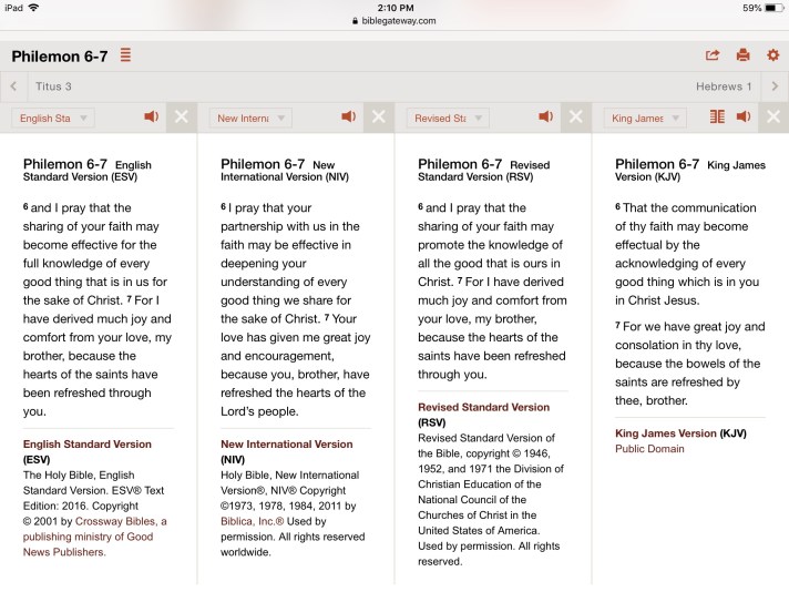 To my ear, this just doesn’t sound like Scripture usually sounds–however Scientific-ly American it may be. Contemporary corporate obsession with things reckoned “Highly Effective” sells millions of lovely Steven Covey books, but simply is not the same spiritual perspective one anticipates from these ancient texts and times. We almost hear that word “effective” today in an exclusively measurable way. Being myself a Greek geek with convalescent idle time, like some sweet-toothed kid at the end of Halloween night, I dug in to the mixed bag to see just what tasty treats I might find. Here’s the ESV, NIV, RSV and KJV for Philemon 6-7 in reverse chronological parallel: