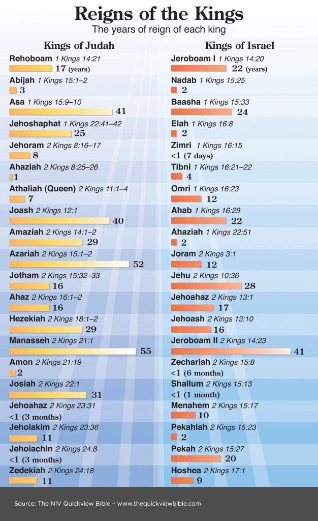 Note the helpful chart graphic below: The reigns of individual kings in both the NORTHERN KINGDOM of Israel and the SOUTHERN KINGDOM of Judah did not exactly parallel as neatly as the chat below might lead one to think. At a glance, our eye presumes that names next to one another must’ve reigned at the same time. There was overlap. For example, locate Joash in the left hand column near the center. He reigned for 40 years in Judah. The king listed to his left, Ahab, ruled the northern kingdom of Israel for only 22 years.