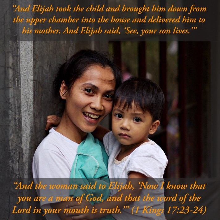 17 After this the son of the woman, the mistress of the house, became ill. And his illness was so severe that there was no breath left in him. 18 And she said to Elijah, “What have you against me, O man of God? You have come to me to bring my sin to remembrance and to cause the death of my son!” 19 And he said to her, “Give me your son.” And he took him from her arms and carried him up into the upper chamber where he lodged, and laid him on his own bed. 20 And he cried to the Lord, “O Lord my God, have you brought calamity even upon the widow with whom I sojourn, by killing her son?” 21 Then he stretched himself upon the child three times and cried to the Lord, “O Lord my God, let this child’s life come into him again.” 22 And the Lord listened to the voice of Elijah. And the life of the child came into him again, and he revived. 23 And Elijah took the child and brought him down from the upper chamber into the house and delivered him to his mother. And Elijah said, “See, your son lives.” 24 And the woman said to Elijah, “Now I know that you are a man of God, and that the word of the Lord in your mouth is truth.”
