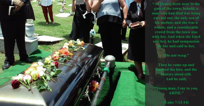 11 Soon afterward he went to a town called Nain, and his disciples and a great crowd went with him. 12 As he drew near to the gate of the town, behold, a man who had died was being carried out, the only son of his mother, and she was a widow, and a considerable crowd from the town was with her. 13 And when the Lord saw her, he had compassion on her and said to her, “Do not weep.” 14 Then he came up and touched the bier, and the bearers stood still. And he said, “Young man, I say to you, arise.” 15 And the dead man sat up and began to speak, and Jesus gave him to his mother. 16 Fear seized them all, and they glorified God, saying, “A great prophet has arisen among us!” and “God has visited his people!” 17 And this report about him spread through the whole of Judea and all the surrounding country.