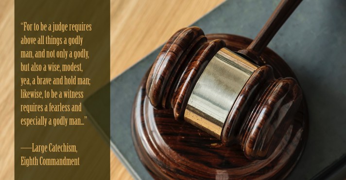 255] Over and above our own body, spouse, and temporal possessions, we have yet another treasure, namely, honor and good report [the illustrious testimony of an upright and unsullied name and reputation], with which we cannot dispense. For it is intolerable to live among men in open shame and general contempt. 256] Therefore God wishes the reputation, good name, and upright character of our neighbor to be taken away or diminished as little as his money and possessions, that every one may stand in his integrity before wife, children, servants, and neighbors. 257] And in the first place, we take the plainest meaning of this commandment according to the words (Thou shalt not bear false witness), as pertaining to the public courts of justice, where a poor innocent man is accused and oppressed by false witnesses in order to be punished in his body, property, or honor.