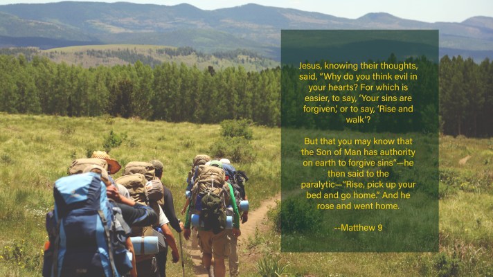 9:1 And getting into a boat he crossed over and came to his own city. 2 And behold, some people brought to him a paralytic, lying on a bed. And when Jesus saw their faith, he said to the paralytic, “Take heart, my son; your sins are forgiven.” 3 And behold, some of the scribes said to themselves, “This man is blaspheming.” 4 But Jesus, knowing their thoughts, said, “Why do you think evil in your hearts? 5 For which is easier, to say, ‘Your sins are forgiven,’ or to say, ‘Rise and walk’? 6 But that you may know that the Son of Man has authority on earth to forgive sins”—he then said to the paralytic—“Rise, pick up your bed and go home.” 7 And he rose and went home. 8 When the crowds saw it, they were afraid, and they glorified God, who had given such authority to men.
