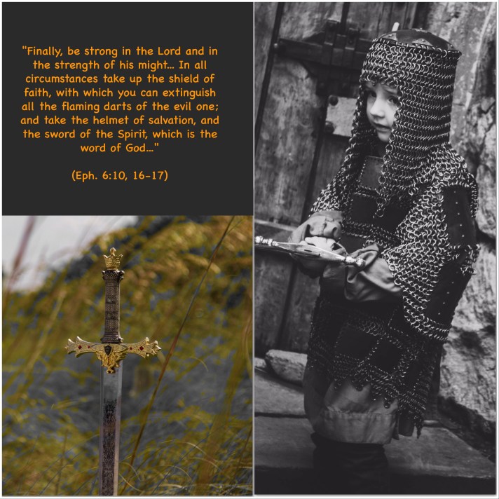 16 In all circumstances take up the shield of faith, with which you can extinguish all the flaming darts of the evil one; 17 and take the helmet of salvation, and the sword of the Spirit, which is the word of God,