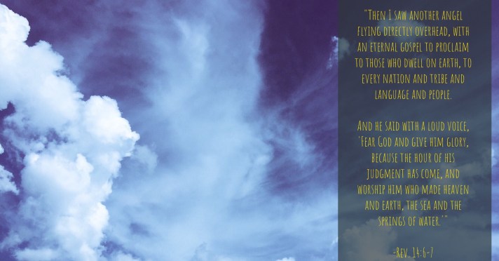 6 Then I saw another angel flying directly overhead, with an eternal gospel to proclaim to those who dwell on earth, to every nation and tribe and language and people. 7 And he said with a loud voice, “Fear God and give him glory, because the hour of his judgment has come, and worship him who made heaven and earth, the sea and the springs of water.”
