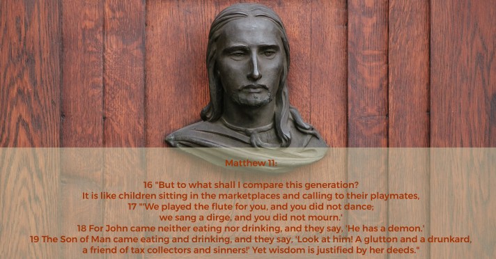 18 For John came neither eating nor drinking, and they say, ‘He has a demon.’ 19 The Son of Man came eating and drinking, and they say, ‘Look at him! A glutton and a drunkard, a friend of tax collectors and sinners!’ Yet wisdom is justified by her deeds.”