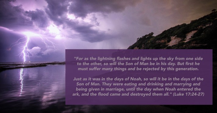 22 And he said to the disciples, “The days are coming when you will desire to see one of the days of the Son of Man, and you will not see it. 23 And they will say to you, ‘Look, there!’ or ‘Look, here!’ Do not go out or follow them. 24 For as the lightning flashes and lights up the sky from one side to the other, so will the Son of Man be in his day. 25 But first he must suffer many things and be rejected by this generation. 26 Just as it was in the days of Noah, so will it be in the days of the Son of Man. 27 They were eating and drinking and marrying and being given in marriage, until the day when Noah entered the ark, and the flood came and destroyed them all. 28 Likewise, just as it was in the days of Lot—they were eating and drinking, buying and selling, planting and building, 29 but on the day when Lot went out from Sodom, fire and sulfur rained from heaven and destroyed them all— 30 so will it be on the day when the Son of Man is revealed.