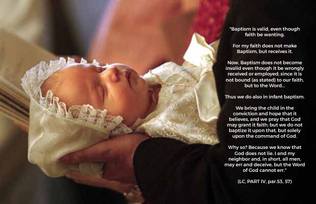 57] Thus we do also in infant baptism. We bring the child in the conviction and hope that it believes, and we pray that God may grant it faith; but we do not baptize it upon that, but solely upon the command of God. Why so? Because we know that God does not lie. I and my neighbor and, in short, all men, may err and deceive, but the Word of God cannot err.
