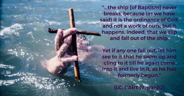 …the ship [of Baptism] never breaks, because (as we have said) it is the ordinance of God, and not a work of ours; but it happens, indeed, that we slip and fall out of the ship. Yet if any one fall out, let him see to it that he swim up and cling to it till he again come into it and live in it, as he had formerly begun.