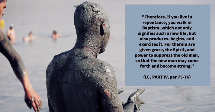 74] And here you see that Baptism, both in its power and signification, comprehends also the third Sacrament, which has been called repentance, 75] as it is really nothing else than Baptism. For what else is repentance but an earnest attack upon the old man [that his lusts be restrained] and entering upon a new life? Therefore, if you live in repentance, you walk in Baptism, which not only signifies such a new life, but also produces, begins, and exercises it. 76] For therein are given grace, the Spirit, and power to suppress the old man, so that the new man may come forth and become strong.