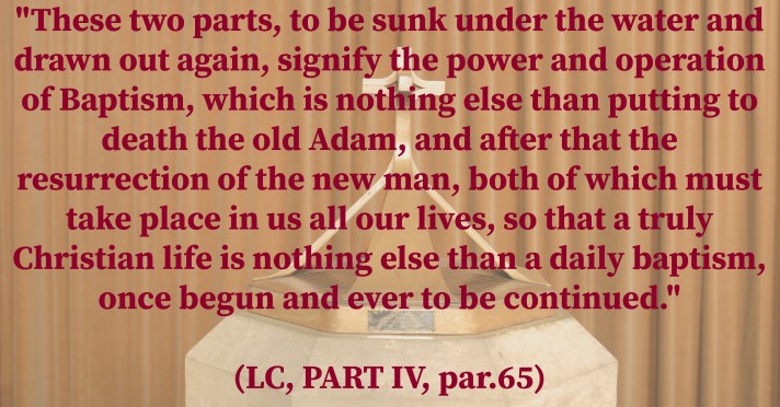 83] Thus it appears what a great, excellent thing Baptism is, which delivers us from the jaws of the devil and makes us God’s own, suppresses and takes away sin, and then daily strengthens the new man; and is and remains ever efficacious until we pass from this estate of misery to eternal glory.