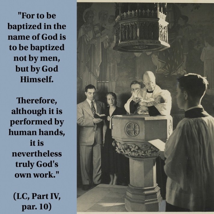 10] For to be baptized in the name of God is to be baptized not by men, but by God Himself. Therefore, although it is performed by human hands, it is nevertheless truly God’s own work. From this fact every one may himself readily infer that it is a far higher work than any work performed by a man or a saint. For what work greater than the work of God can we do?