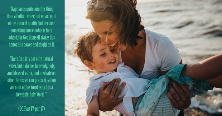 14] From this now learn a proper understanding of the subject, and how to answer the question what Baptism is, namely thus, that it is not mere ordinary water, but water comprehended in God’s Word and command, and sanctified thereby, so that it is nothing else than a divine water; not that the water in itself is nobler than other water, but that God’s Word and command are added.