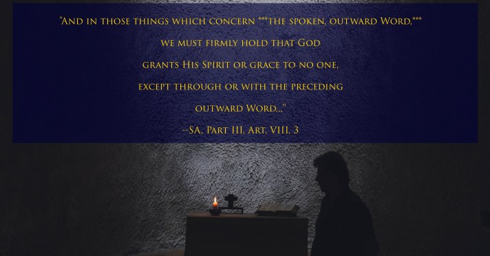 9] In a word, enthusiasm inheres in Adam and his children from the beginning [from the first fall] to the end of the world, [its poison] having been implanted and infused into them by the old dragon, and is the origin, power [life], and strength of all heresy, especially of that of the Papacy and Mahome[d]. 10] Therefore we ought and must constantly maintain this point, that God does not wish to deal with us otherwise than through the spoken Word and the Sacraments. 11] It is the devil himself whatsoever is extolled as Spirit without the Word and Sacraments. For God wished to appear even to Moses through the burning bush and spoken Word; and no prophet neither Elijah nor Elisha, received the Spirit without the Ten Commandments [or spoken Word]. 12] Neither was John the Baptist conceived without the preceding word of Gabriel, nor did he leap in his mother’s womb without the voice of Mary. 13] And Peter says, 2 Pet. 1:21: The prophecy came not by the will of man; but holy men of God spake as they were moved by the Holy Ghost. Without the outward Word, however, they were not holy, much less would the Holy Ghost have moved them to speak when they still were unholy [or profane]; for they were holy, says he, since the Holy Ghost spake through them.