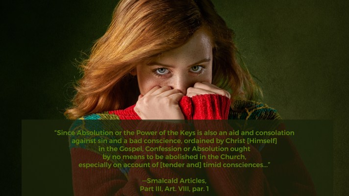 1] Since Absolution or the Power of the Keys is also an aid and consolation against sin and a bad conscience, ordained by Christ [Himself] in the Gospel, Confession or Absolution ought by no means to be abolished in the Church, especially on account of [tender and] timid consciences and on account of the untrained [and capricious] young people, in order that they may be examined, and instructed in the Christian doctrine.