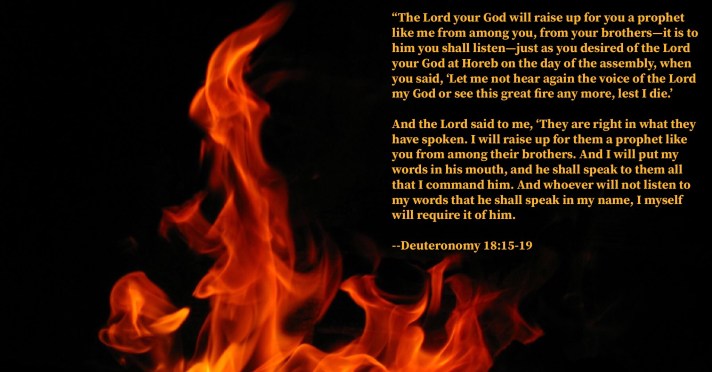 15 “The Lord your God will raise up for you a prophet like me from among you, from your brothers—it is to him you shall listen— 16 just as you desired of the Lord your God at Horeb on the day of the assembly, when you said, ‘Let me not hear again the voice of the Lord my God or see this great fire any more, lest I die.’ 17 And the Lord said to me, ‘They are right in what they have spoken. 18 I will raise up for them a prophet like you from among their brothers. And I will put my words in his mouth, and he shall speak to them all that I command him. 19 And whoever will not listen to my words that he shall speak in my name, I myself will require it of him.