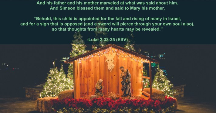 33 And his father and his mother marveled at what was said about him. 34 And Simeon blessed them and said to Mary his mother, “Behold, this child is appointed for the fall and rising of many in Israel, and for a sign that is opposed 35 (and a sword will pierce through your own soul also), so that thoughts from many hearts may be revealed.”