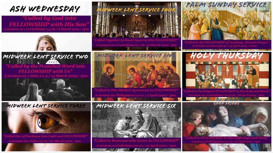 Our special Midweek and Holy Week services will take up the gift of Christian Fellowship. We explore nine key passages which describe many different facets of Fellowship in His Word. This page will serve as the central hub for sermon schedule, audio and other resources throughout our Lenten season.
