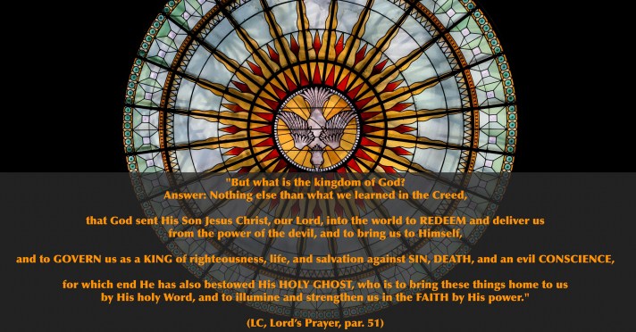 51] But what is the kingdom of God? Answer: Nothing else than what we learned in the Creed, that God sent His Son Jesus Christ, our Lord, into the world to redeem and deliver us from the power of the devil, and to bring us to Himself, and to govern us as a King of righteousness, life, and salvation against sin, death, and an evil conscience, for which end He has also bestowed His Holy Ghost, who is to bring these things home to us by His holy Word, and to illumine and strengthen us in the faith by His power.