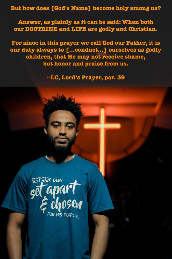 39] But how does it become holy among us? Answer, as plainly as it can be said: When both our doctrine and life are godly and Christian. For since in this prayer we call God our Father, it is our duty always to deport and demean ourselves as godly children, that He may not receive shame, but honor and praise from us.