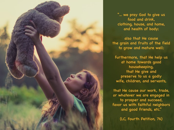 76] Let this be a very brief explanation and sketch, showing how far this petition extends through all conditions on earth. Of this any one might indeed make a long prayer, and with many words enumerate all the things that are included therein, as that we pray God to give us food and drink, clothing, house, and home, and health of body; also that He cause the grain and fruits of the field to grow and mature well; furthermore, that He help us at home towards good housekeeping, that He give and preserve to us a godly wife, children, and servants, that He cause our work, trade, or whatever we are engaged in to prosper and succeed, favor us with faithful neighbors and good friends, etc. 77] Likewise, that He give to emperors, kings, and all estates, and especially to the rulers of our country and to all counselors, magistrates, and officers, wisdom, strength, and success that they may govern well and vanquish the Turks and all enemies; to subjects and the common people, obedience, peace, and harmony in their life with one another; 78] and on the other hand, that He would preserve us from all sorts of calamity to body and livelihood, as lightning, hail, fire, flood, poison, pestilence, cattle-plague, war and bloodshed, famine, destructive beasts, wicked men, etc. 79] All this it is well to impress upon the simple, namely, that these things come from God, and must be prayed for by us.