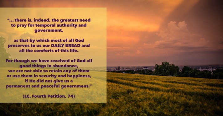 73] To comprise it briefly, this petition includes everything that belongs to our entire life in the world, because on that account alone do we need daily bread. Now for our life it is not only necessary that our body have food and covering and other necessaries, but also that we spend our days in peace and quiet among the people with whom we live and have intercourse in daily business and conversation and all sorts of doings, in short, whatever pertains both to the domestic and to the neighborly or civil relation and government. For where these two things are hindered [intercepted and disturbed] that they do not prosper as they ought, the necessaries of life also are impeded, so that ultimately life cannot be maintained. 74] And there is, indeed, the greatest need to pray for temporal authority and government, as that by which most of all God preserves to us our daily bread and all the comforts of this life. For though we have received of God all good things in abundance, we are not able to retain any of them or use them in security and happiness, if He did not give us a permanent and peaceful government. For where there are dissension, strife, and war, there the daily bread is already taken away, or at least checked.