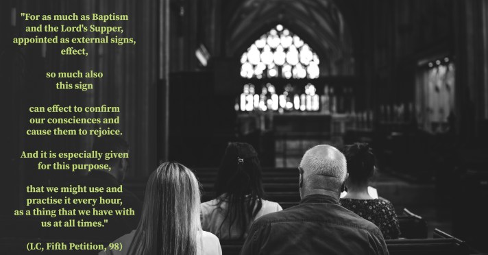 97] This sign is therefore attached to this petition, that, when we pray, we remember the promise and reflect thus: Dear Father, for this reason I come and pray Thee to forgive me, not that I can make satisfaction, or can merit anything by my works, but because Thou hast promised and attached the seal thereto that I should be as sure as though I had absolution pronounced by Thyself. 98] For as much as Baptism and the Lord’s Supper, appointed as external signs, effect, so much also this sign can effect to confirm our consciences and cause them to rejoice. And it is especially given for this purpose, that we might use and practise it every hour, as a thing that we have with us at all times.