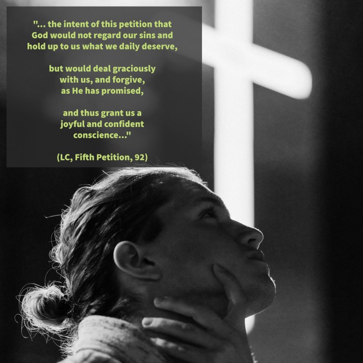 92] It is therefore the intent of this petition that God would not regard our sins and hold up to us what we daily deserve, but would deal graciously with us, and forgive, as He has promised, and thus grant us a joyful and confident conscience to stand before Him in prayer. For where the heart is not in right relation towards God, nor can take such confidence, it will nevermore venture to pray. But such a confident and joyful heart can spring from nothing else than the [certain] knowledge of the forgiveness of sin.