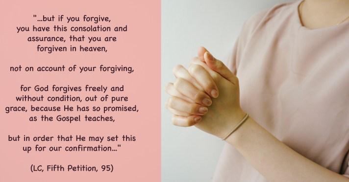 93] But there is here attached a necessary, yet consolatory addition: As we forgive. He has promised that we shall be sure that everything is forgiven and pardoned, yet in the manner that we also forgive our neighbor. 94] For just as we daily sin much against God, and yet He forgives everything through grace, so we, too, must ever forgive our neighbor who does us injury, violence, and wrong, shows malice toward us, etc. 95] If, therefore, you do not forgive, then do not think that God forgives you; but if you forgive, you have this consolation and assurance, that you are forgiven in heaven, not on account of your forgiving, for God forgives freely and without condition, out of pure grace, because He has so promised, as the Gospel teaches, but in order that He may set this up for our confirmation and assurance for a sign alongside of the promise which accords with this prayer, Luke 6:37: Forgive, and ye shall be forgiven. Therefore Christ also repeats it soon after the Lord’s Prayer, and says, Matt. 6:14: For if ye forgive men their trespasses, your heavenly Father will also forgive you, etc.
