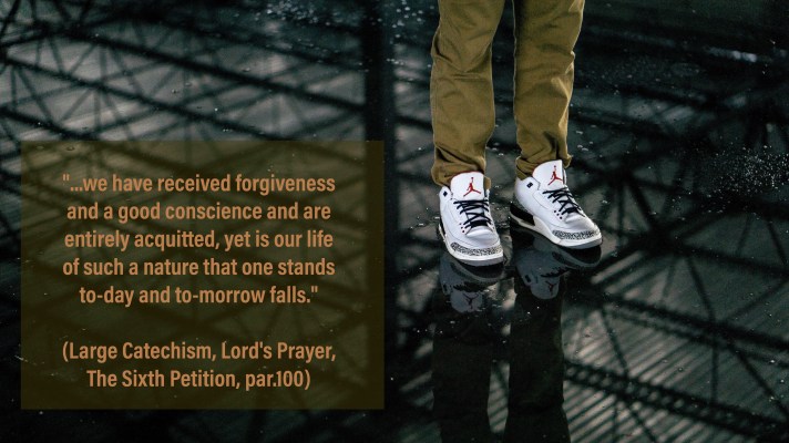 100] We have now heard enough what toil and labor is required to retain all that for which we pray, and to persevere therein, which, however, is not achieved without infirmities and stumbling. Besides, although we have received forgiveness and a good conscience and are entirely acquitted, yet is our life of such a nature that one stands to-day and to-morrow falls. Therefore, even though we be godly now and stand before God with a good conscience, we must pray again that He would not suffer us to relapse and yield to trials and temptations.