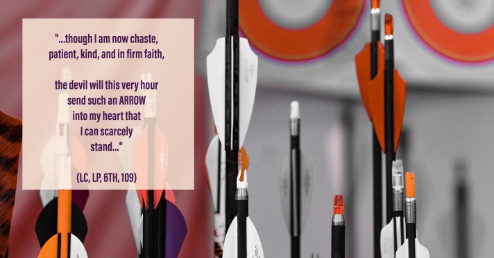 109] Therefore we Christians must be armed and daily expect to be incessantly attacked, in order that no one may go on in security and heedlessly, as though the devil were far from us, but at all times expect and parry his blows. For though I am now chaste, patient, kind, and in firm faith, the devil will this very hour send such an arrow into my heart that I can scarcely stand. For he is an enemy that never desists nor becomes tired, so that when one temptation ceases, there always arise others and fresh ones.