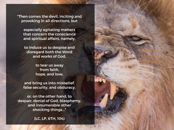 104] Then comes the devil, inciting and provoking in all directions, but especially agitating matters that concern the conscience and spiritual affairs, namely, to induce us to despise and disregard both the Word and works of God, to tear us away from faith, hope, and love, and bring us into misbelief, false security, and obduracy, or, on the other hand, to despair, denial of God, blasphemy, and innumerable other shocking things. These are indeed snares and nets, yea, real fiery darts which are shot most venomously into the heart, not by flesh and blood, but by the devil.