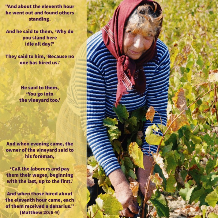 1 [Jesus said] “For the kingdom of heaven is like a master of a house who went out early in the morning to hire laborers for his vineyard. 2 After agreeing with the laborers for a denarius a day, he sent them into his vineyard. 3 And going out about the third hour he saw others standing idle in the marketplace, 4 and to them he said, ‘You go into the vineyard too, and whatever is right I will give you.’ 5 So they went. Going out again about the sixth hour and the ninth hour, he did the same. 6 And about the eleventh hour he went out and found others standing. And he said to them, ‘Why do you stand here idle all day?’ 7 They said to him, ‘Because no one has hired us.’ He said to them, ‘You go into the vineyard too.’ 8 And when evening came, the owner of the vineyard said to his foreman, ‘Call the laborers and pay them their wages, beginning with the last, up to the first.’ 9 And when those hired about the eleventh hour came, each of them received a denarius. 10 Now when those hired first came, they thought they would receive more, but each of them also received a denarius. 11 And on receiving it they grumbled at the master of the house, 12 saying, ‘These last worked only one hour, and you have made them equal to us who have borne the burden of the day and the scorching heat.’ 13 But he replied to one of them, ‘Friend, I am doing you no wrong. Did you not agree with me for a denarius? 14 Take what belongs to you and go. I choose to give to this last worker as I give to you. 15 Am I not allowed to do what I choose with what belongs to me? Or do you begrudge my generosity?’ 16 So the last will be first, and the first last.”