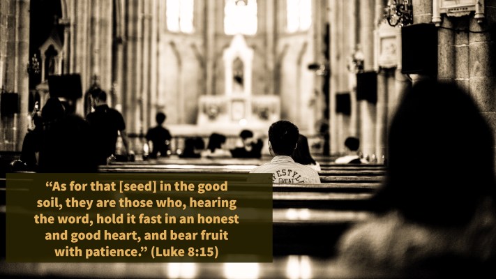 9 And when his disciples asked him what this parable meant, 10 he said, “To you it has been given to know the secrets of the kingdom of God, but for others they are in parables, so that ‘seeing they may not see, and hearing they may not understand.’ 11 Now the parable is this: The seed is the word of God. 12 The ones along the path are those who have heard; then the devil comes and takes away the word from their hearts, so that they may not believe and be saved. 13 And the ones on the rock are those who, when they hear the word, receive it with joy. But these have no root; they believe for a while, and in time of testing fall away. 14 And as for what fell among the thorns, they are those who hear, but as they go on their way they are choked by the cares and riches and pleasures of life, and their fruit does not mature. 15 As for that in the good soil, they are those who, hearing the word, hold it fast in an honest and good heart, and bear fruit with patience.