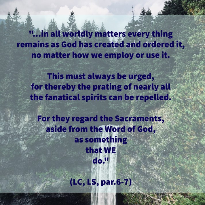4] Here also we do not wish to enter into controversy and contend with the traducers and blasphemers of this Sacrament, but to learn first (as we did regarding Baptism) what is of the greatest importance, namely, that the chief point is the Word and ordinance or command of God. For it has not been invented nor introduced by any man, but without any one’s counsel and deliberation it has been instituted by Christ. 5] Therefore, just as the Ten Commandments, the Lord’s Prayer, and the Creed retain their nature and worth, although you never keep, pray, or believe them, so also does this venerable Sacrament remain undisturbed, so that nothing is detracted or taken from it, even though we employ and dispense it unworthily. 6] What do you think God cares about what we do or believe, so that on that account He should suffer His ordinance to be changed? Why, in all worldly matters every thing remains as God has created and ordered it, no matter how we employ or use it. 7] This must always be urged, for thereby the prating of nearly all the fanatical spirits can be repelled. For they regard the Sacraments, aside from the Word of God, as something that we do.