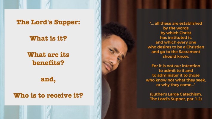 1] In the same manner as we have heard regarding Holy Baptism, we must speak also concerning the other Sacrament, namely, these three points: What is it? What are its benefits? and, Who is to receive it? And all these are established by the words by which Christ has instituted it, 2] and which every one who desires to be a Christian and go to the Sacrament should know. For it is not our intention to admit to it and to administer it to those who know not what they seek, or why they come. The words, however, are these: