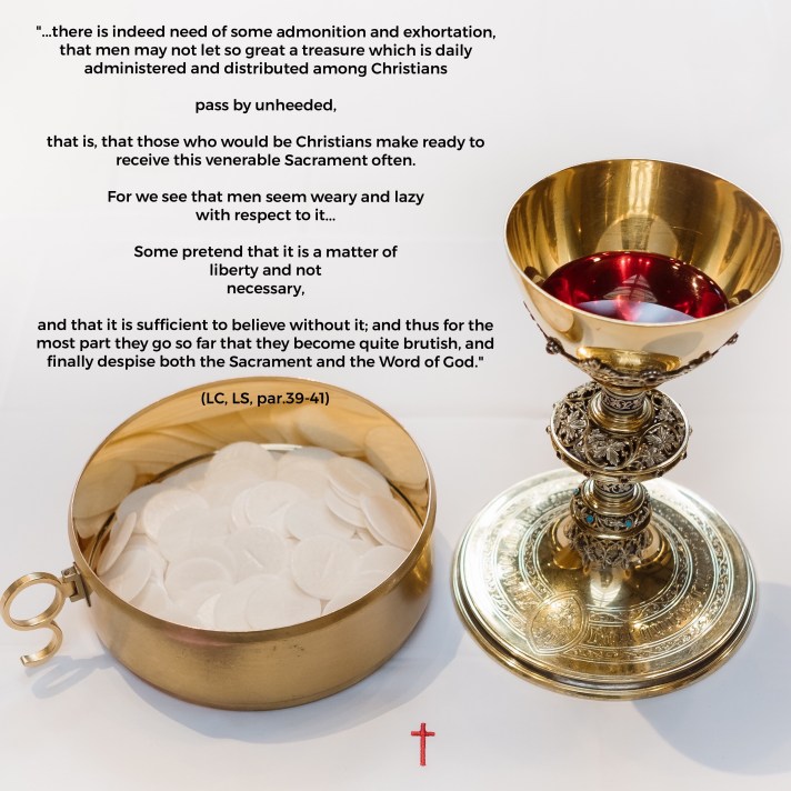 39] In conclusion, since we have now the true understanding and doctrine of the Sacrament, there is indeed need of some admonition and exhortation, that men may not let so great a treasure which is daily administered and distributed among Christians pass by unheeded, that is, that those who would be Christians make ready to receive this venerable Sacrament often. 40] For we see that men seem weary and lazy with respect to it; and there is a great multitude of such as hear the Gospel, and, because the nonsense of the Pope has been abolished, and we are freed from his laws and coercion, go one, two, three years, or even longer without the Sacrament, as though they were such strong Christians that they have no need of it; 41] and some allow themselves to be prevented and deterred by the pretense that we have taught that no one should approach it except those who feel hunger and thirst, which urge them to it. Some pretend that it is a matter of liberty and not necessary, and that it is sufficient to believe without it; and thus for the most part they go so far that they become quite brutish, and finally despise both the Sacrament and the Word of God.