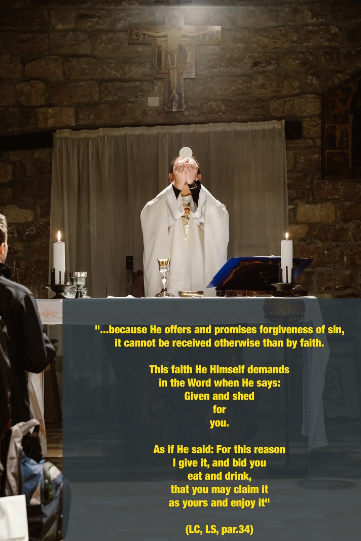 33] Thus we have the entire Sacrament, both as to what it is in itself and as to what it brings and profits. Now we must also see who is the person that receives this power and benefit. That is answered briefly, as we said above of Baptism and often elsewhere: Whoever believes it has what the words declare and bring. For they are not spoken or proclaimed to stone and wood, but to those who hear them, to whom He says: 34]Take and eat, etc. And because He offers and promises forgiveness of sin, it cannot be received otherwise than by faith. This faith He Himself demands in the Word when He says: Given and shed for you. As if He said: For this reason I give it, and bid you eat and drink, that you may claim it as yours and enjoy it. 35] Whoever now accepts these words, and believes that what they declare is true, has it. But whoever does not believe it has nothing, as he allows it to be offered to him in vain, and refuses to enjoy such a saving good. The treasure, indeed, is opened and placed at every one’s door, yea, upon his table, but it is necessary that you also claim it, and confidently view it as the words suggest to you 36] This, now, is the entire Christian preparation for receiving this Sacrament worthily. For since this treasure is entirely presented in the words, it cannot be apprehended and appropriated in any other way than with the heart. For such a gift and eternal treasure cannot be seized with the fist. 37] Fasting and prayer, etc., may indeed be an external preparation and discipline for children, that the body may keep and bear itself modestly and reverently towards the body and blood of Christ; yet what is given in and with it the body cannot seize and appropriate. But this is done by the faith of the heart, which discerns this treasure and desires it. 38] This may suffice for what is necessary as a general instruction respecting this Sacrament; for what is further to be said of it belongs to another time.