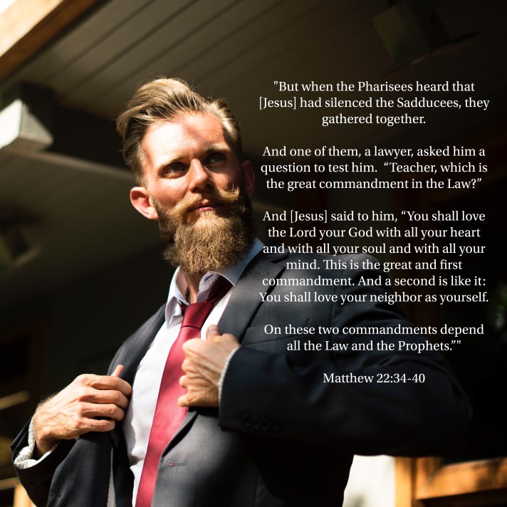 34 But when the Pharisees heard that he had silenced the Sadducees, they gathered together. 35 And one of them, a lawyer, asked him a question to test him. 36 “Teacher, which is the great commandment in the Law?” 37 And he said to him, “You shall love the Lord your God with all your heart and with all your soul and with all your mind. 38 This is the great and first commandment. 39 And a second is like it: You shall love your neighbor as yourself. 40 On these two commandments depend all the Law and the Prophets.”