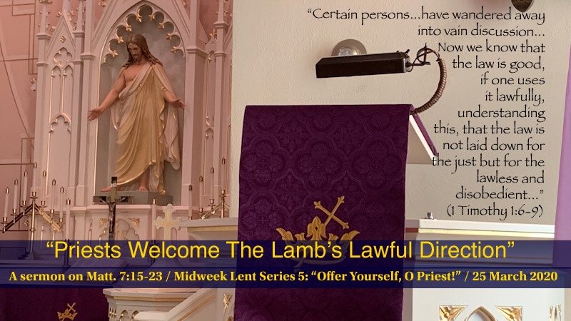 Neither legalistic nor lawless, such priests learn lawfully to welcome our Lord’s “teaching, rebuke, correction and training in the righteousness.” (2 Tim. 3:16ff) —a righteousness that is ours only by grace, through faith in Christ alone—not by works of the Law!
