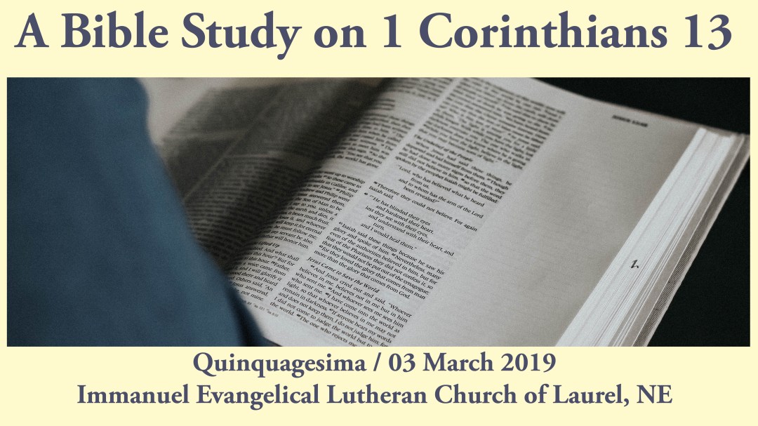 The great and precious jewel of Love is held before the congregation for all to behold, and to adorn the Bride of Christ for life everlasting. Hear the full audio of Bible Study from March 03 INTRODUCTION: Don't Try to Pry the Diamond of Love AwayChristians often like to hear today's passage from 1 Corinthians … Continue reading Bible Study Notes and Audio from 03.03.2013